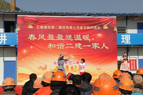 “春風(fēng)盈盈送溫暖、和諧二建一家人?!?1月14日至15日,公司團(tuán)委組織公司文藝團(tuán)隊(duì)到昭通市昭陽區(qū)2013年保障房項(xiàng)目開展春節(jié)慰問演出,為項(xiàng)目一線的職工和工友們送去新春佳節(jié)的祝福。